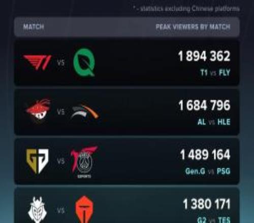 電競(jìng)體育10月16報(bào)道 昨日瑞士輪首輪的比賽已經(jīng)全部結(jié)束了,而今日凌晨外媒數(shù)據(jù)平臺(tái)公布了昨日海外收視率前四的統(tǒng)計(jì):其中T1以將近190萬(wàn)的收視人數(shù)遙遙領(lǐng)先。