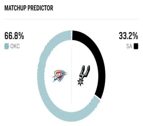 賽前,美媒ESPN對(duì)本場(chǎng)比賽進(jìn)行了勝率預(yù)測(cè),馬刺隊(duì)勝率僅有33.2%,依舊不被看好,雷霆隊(duì)勝率則高達(dá)66.8% 。
